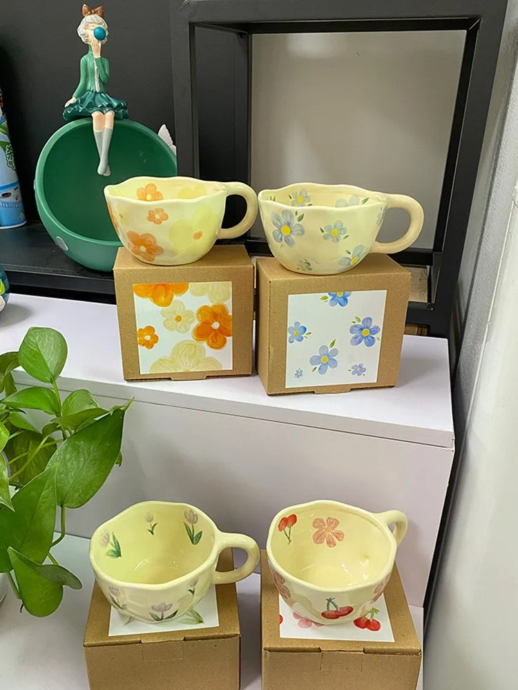 Ceramic Mugs Coffee Cups Hand Pinched Irregular Flower Milk Tea Cup ins korean style Oatmeal Breakfast Mug Drinkware Kitchen